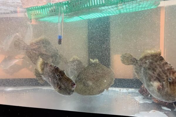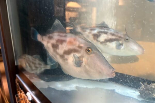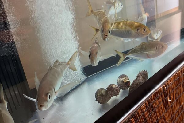 生簀の魚が泳ぐ活気ある空間