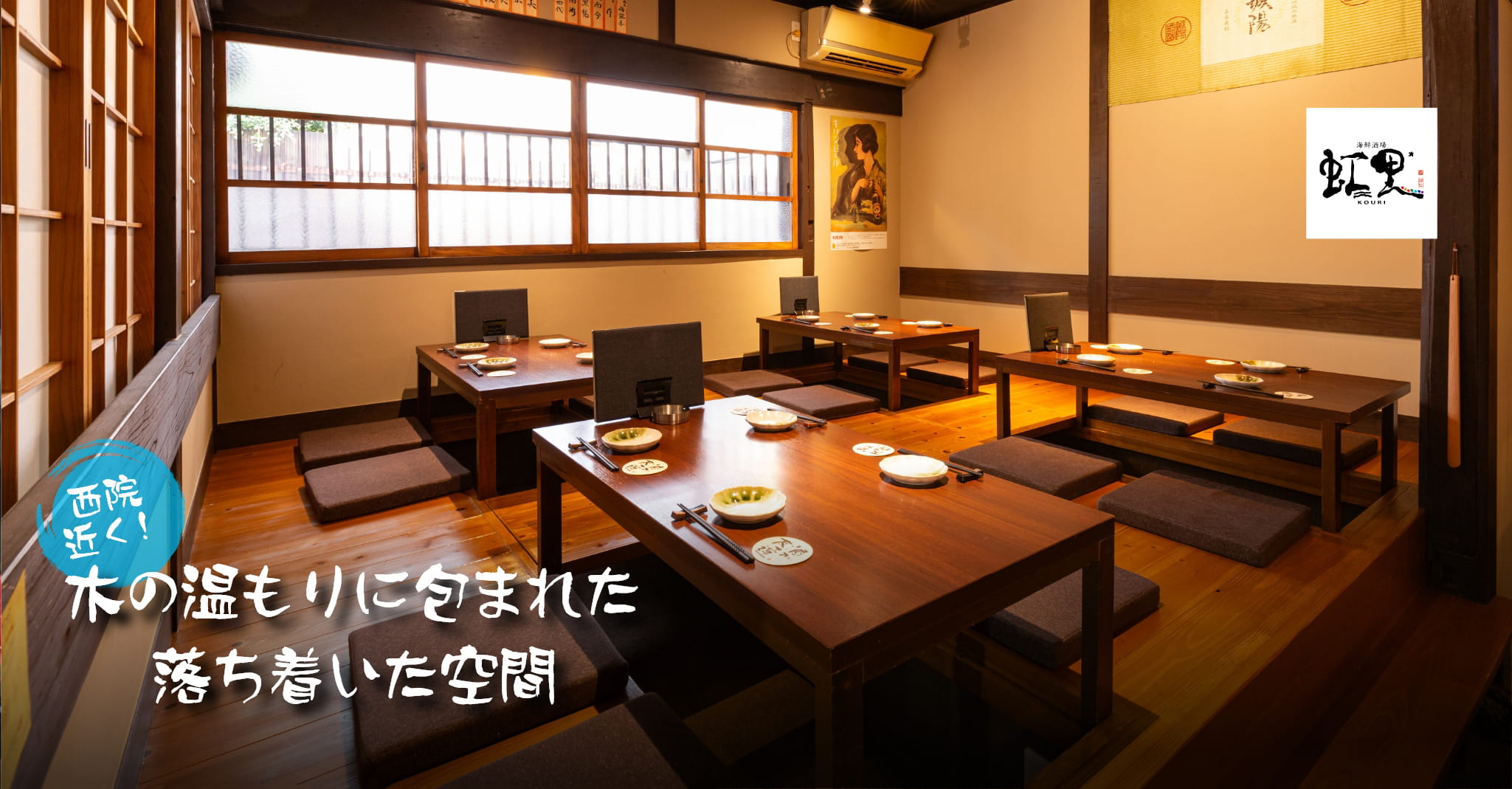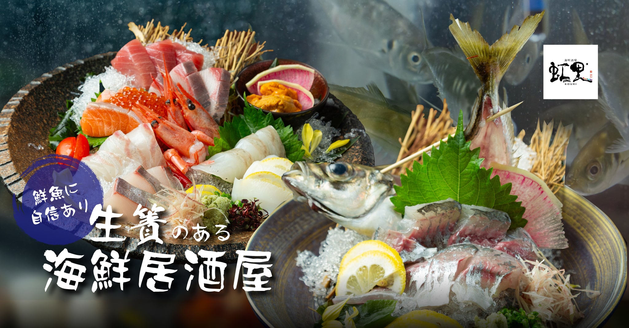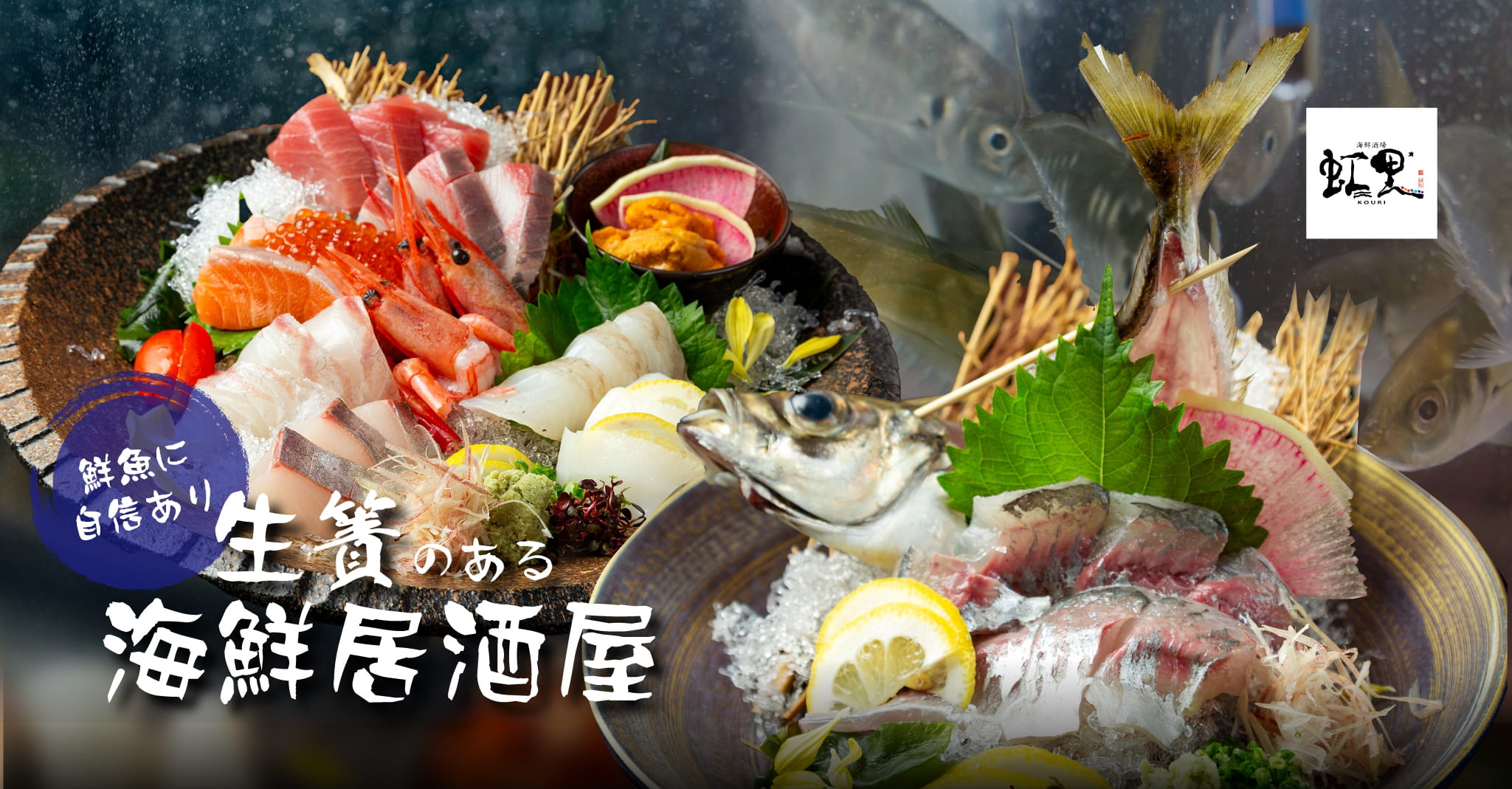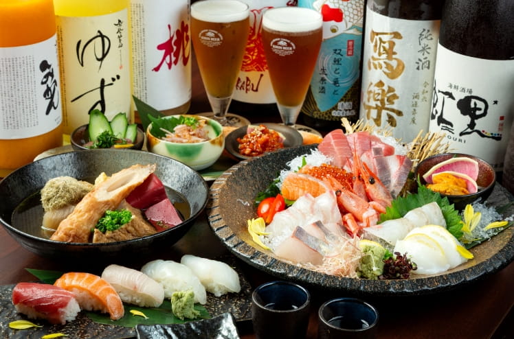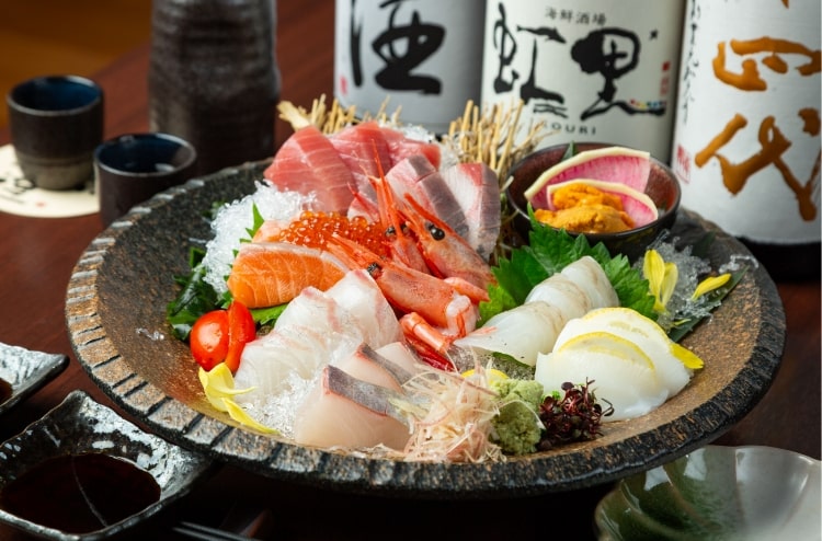 京都・西院の「海鮮酒場 虹里」は、海鮮と日本酒が自慢の居酒屋です。店内の生簀で泳ぐ鮮魚をその場で捌き、活け造りや握りでご提供。さらに、京おでんやおばんざいなど名物料理も豊富に揃えています。飲み放題付きコースも充実しており、仕事帰りの一杯からご宴会まで、さまざまなシーンでご利用いただけます。
