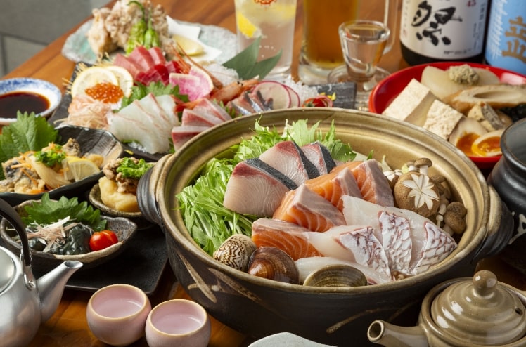 忘年会など冬の宴会にぴったりの海鮮鍋が主役【鍋コース】、旬の食材を盛り込んだ【季節のコース】、お酒がすすむ味覚を楽しむ【肴コース】の3種類をご用意。いずれも名物料理を取り入れた90分飲み放題付きで、少人数から大人数まで幅広くご利用いただけます。