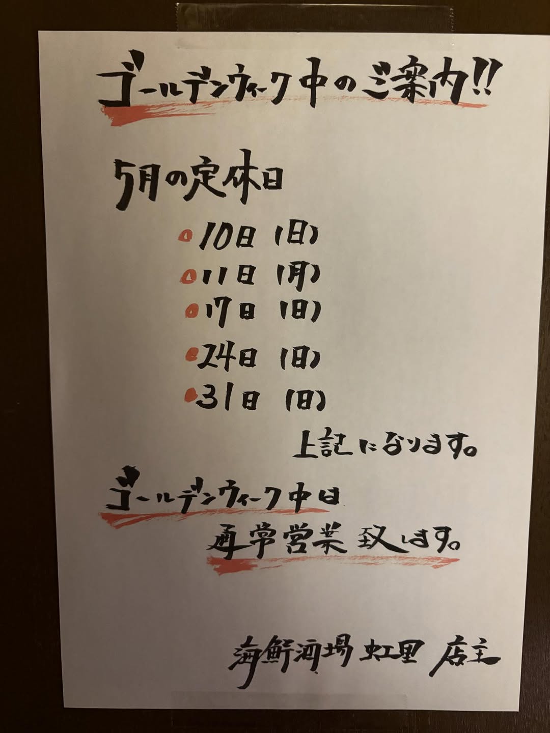 海鮮酒場虹里です🌈 ゴールデンウィーク中の営業日案内です📣📣 […]